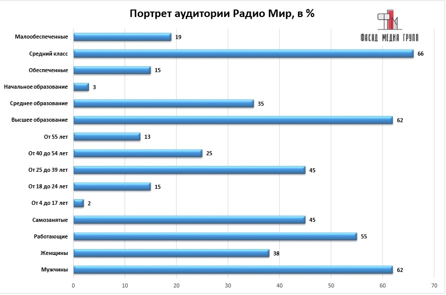 Благодаря качественному, сбалансированному контенту аудитория «Радио Мир» многочисленна и разнообразна.
