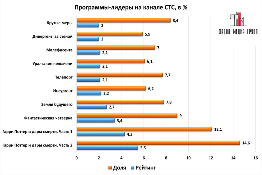 Популярность телеэфира на «СТС» приводит к ежегодному увеличению спроса на рекламное время. Для привлечения клиентов из разных регионов России, увеличения процента продаж, повышения имиджа компании и узнаваемости бренда – размещайте рекламу на «СТС». «СТС» – это проверенный и востребованный канал для размещения рекламы на изобильненском ТВ. Для размещения рекламы на телевидении обращайтесь в рекламное агентство «Фасад Медиа Групп». Будем рады сотрудничеству.